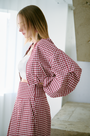 | ギンガム素材 | 表地:綿52% ポリエステル45% ポリウレタン3% 裏地:ポリエステル100% |