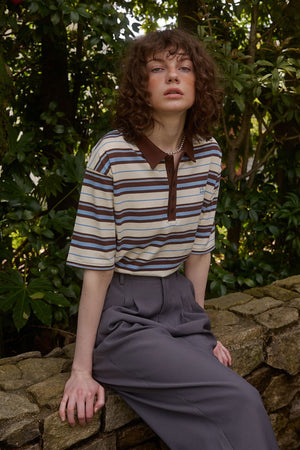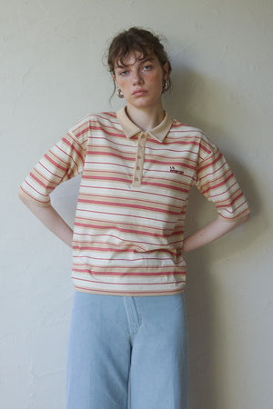 多色使いのランダムボーダーと、胸元に浮き出たフロッキーロゴプリントがポイントです。