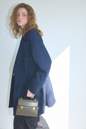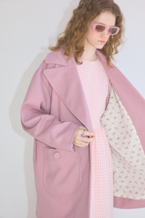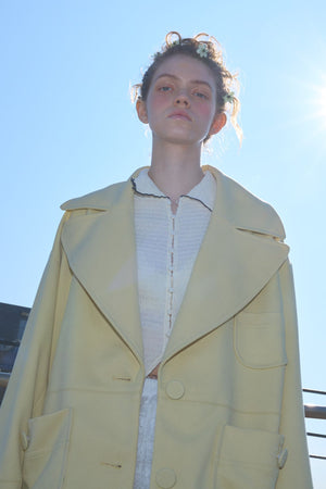 ・大きく大胆な衿と、大きなくるみボタンが特徴のスプリングコート