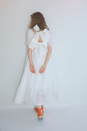 ・前面やお袖は、余計なディテールは削ぎ落とし、バックスタイルの大きなおリボンがポイント