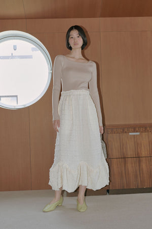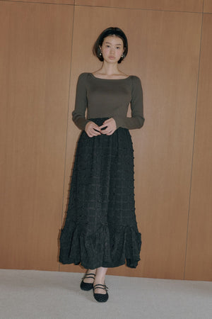 ・着やすいハイゲージニットトップスと凹凸感が可愛いスカートのドッキングデザイン
