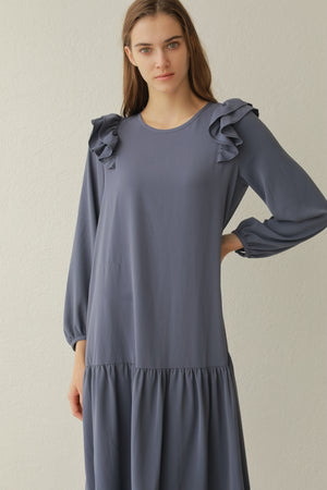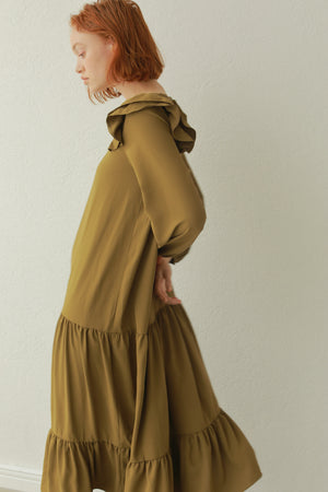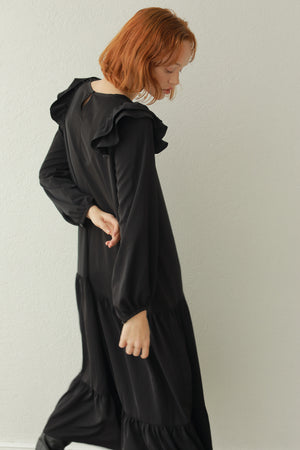 肩口のフリルとヒップ下のティアードデザインが特徴的なワンピース。