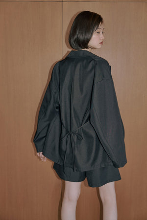 ・脇に付いている紐を後ろで結んでシェイプさせてもゆるく結んでニュアンスでも、様々なジャケットシルエットで着用いただけます